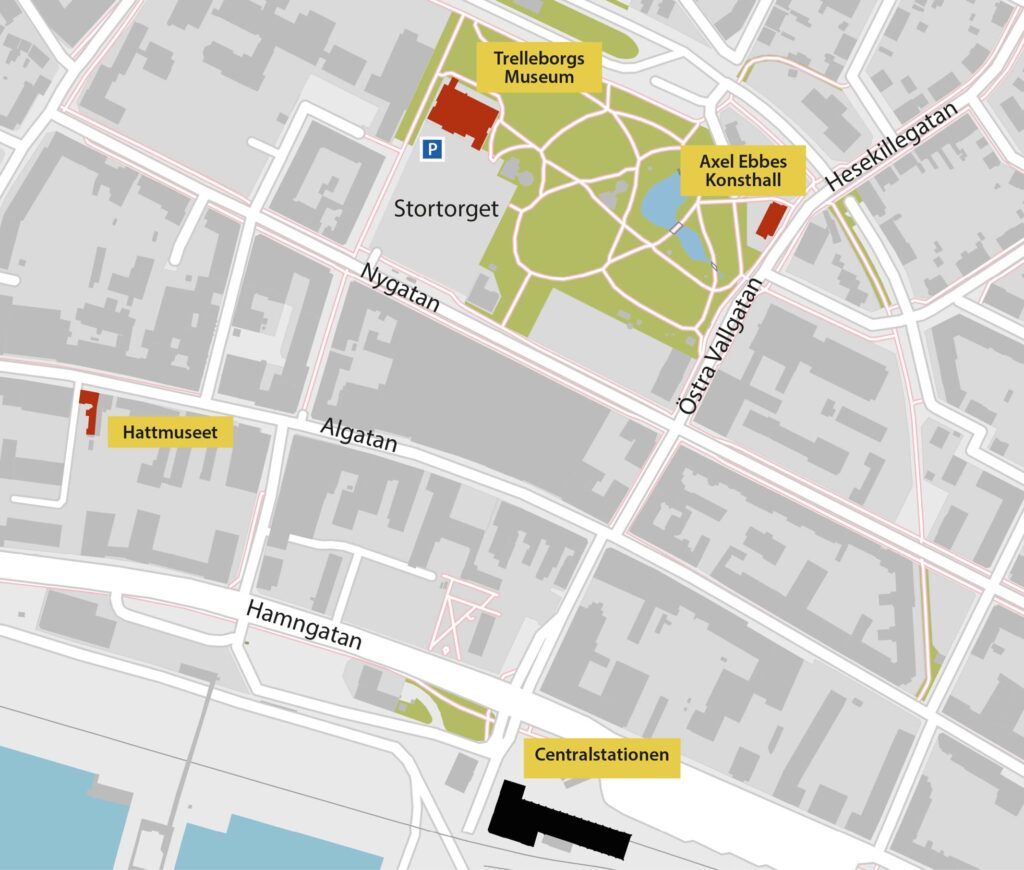 Stadsbuss 1 och 3 stannar på Stortorget precis intill Trelleborgs Museum, tre minuters promenad från Konsthallen.